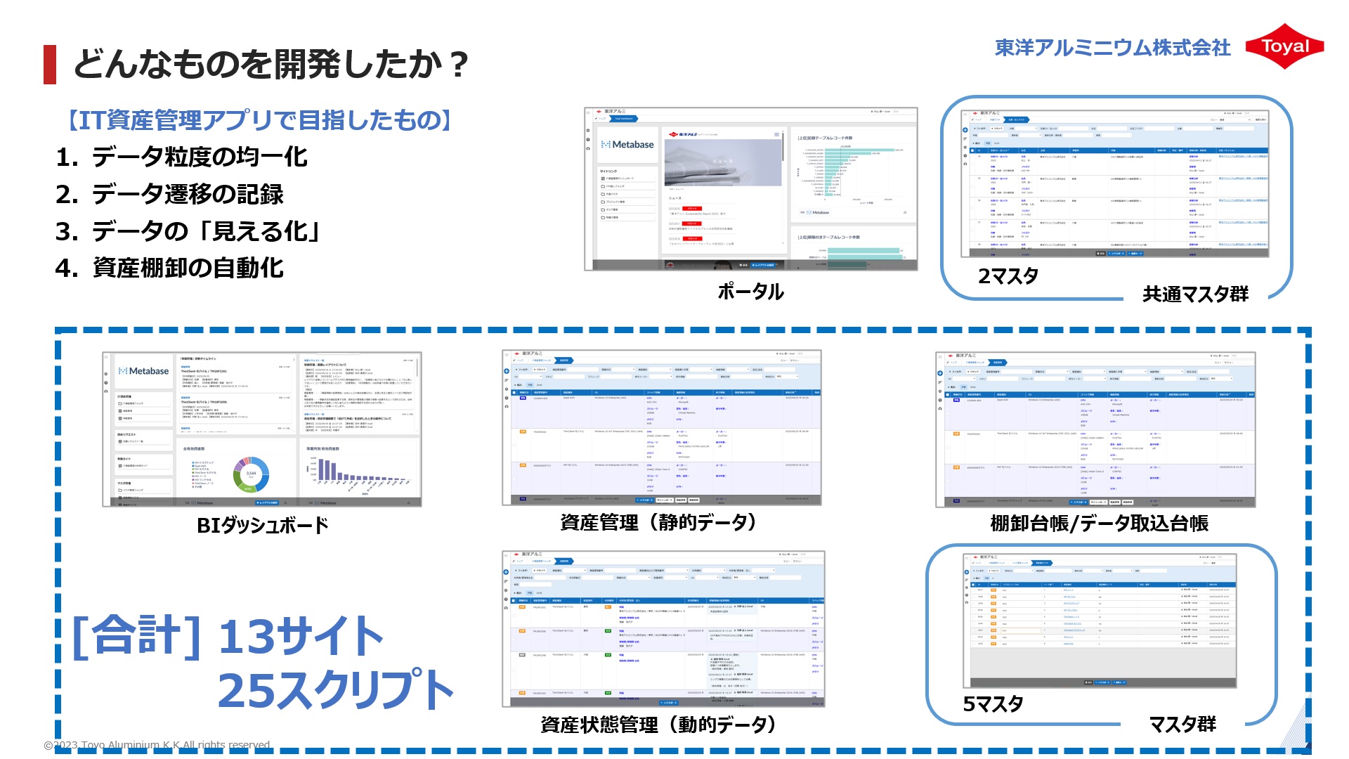 東洋アルミニウムは日本軽金属ホールディングスに属し、日本と海外に拠点を構え、国内外に向けてアルミ製品を製造・販売する会社です。東京や大阪のオフィス、日本各地の製造所で使われている3000台以上の端末(クライアントPC+VDI)の資産管理を精緻化するため、完全な“脱Excel”を敢行し、プリザンターによる管理に移行。端末の「静的データ(資産管理番号、PCのメーカー、スペックなど)」に加え、「動的データ(稼働情報や配置場所、利用者など)」「履歴データ(動的データの遷移履歴)」を記録する3次元的なデータ管理設計を行うことで、各端末が今どこにあって誰が利用しているのか、稼働中、在庫、廃棄済など現在どのような状況にあるのかが一目瞭然になるシステムの開発を実現しています(詳細は「前編」を参照)。