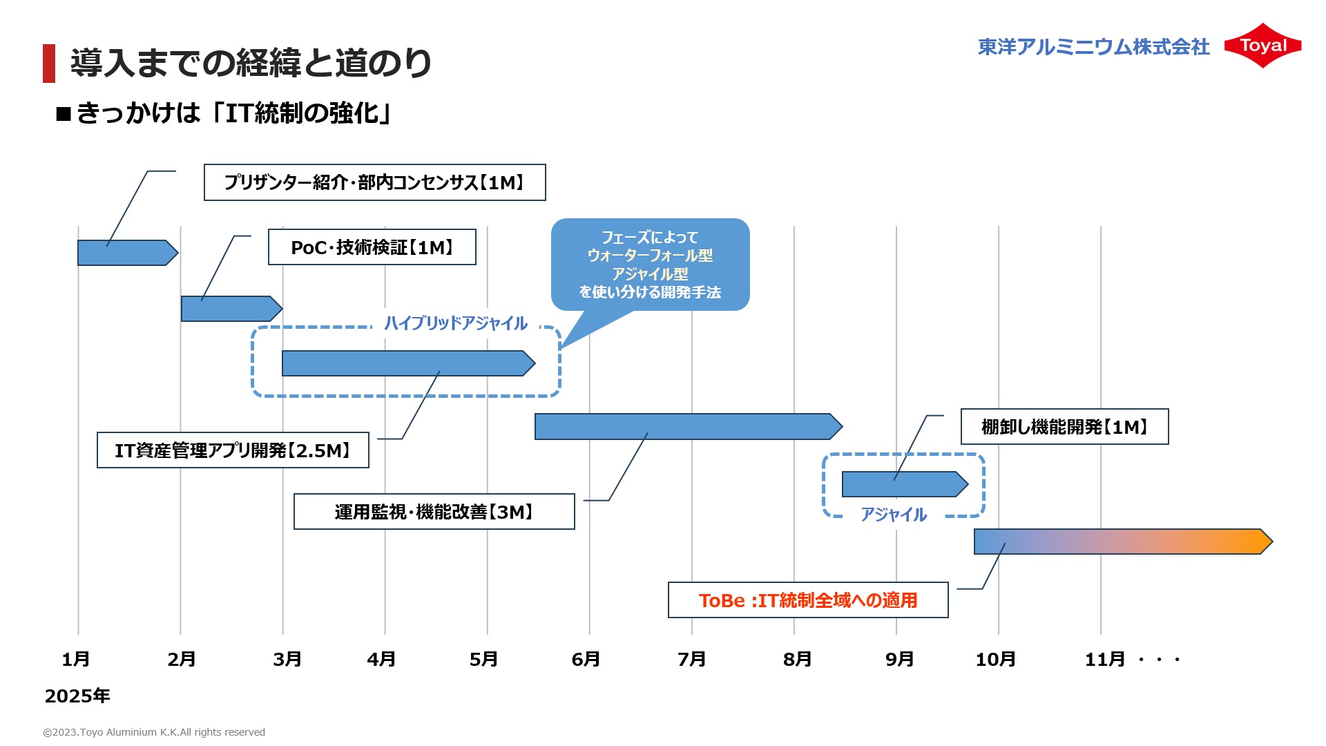 今後、同社ではプリザンターを基盤としてITSMを構築し、IT統制へ活用していく計画です。企画チームのリーダーである瀬戸川聡氏はその構想を次のように説明します。「北岡チームが進めている業務システムのインシデント管理以外にも、問題管理、プログラムなどの変更管理、リリース管理、構成管理など、ITSMのプロセスをプリザンターでカバーできる範囲は多岐にわたります。まずは構想や管理設計、運用方針をエヴァンジェリストである杉山が中心となって整備し、順次システムを内製化するプロジェクトを進めていく計画です。」