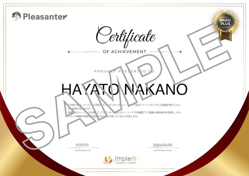 こちらに表示されているのは、実際の修了証のサンプルとなりますので、参考にご覧ください。